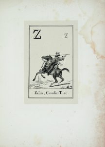 Les figures proposées sont des représentations d'objets et de personnages militaires, tels que le Bonnet de grenadier, la Cuirasse, les Haches, l'Invalide, le Kolback, les Lances, le Mortier, l'Uniforme, etc. La lettre N représente un «Nègre» et la lettre Z «Zaïm, cavalier turc».