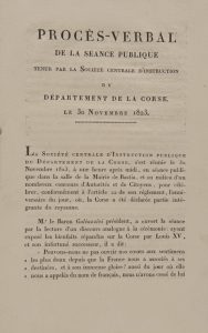 Procès-verbal de la séance publique tenue par la société centrale d’instruction du département de la Corse le 30 novembre 1823.