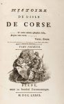 [POMMEREUL, François René Jean de] - Histoire de l’isle de Corse. Berne  : chez la Soc. Typ., 1779. - 2 v. (279, 347 - [4] p.)  ; in-8°, veau porphyre, dos lisse richement orné et doré initiale P. en pied, pièce de titre et de...