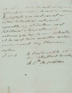 L’impossibilité (d’entrer ?) dans le port de Bastia me fait prendre le parti de venir mouiller ici d’où je compte mener les troupes par terre à Bastia mais pour cet effet j’ai besoin votre secours ainsi je vous prie Monsieur de nous procurer … cent dix chevaux pour les officiers hors d’état de faire cette journée à pied et vingt mulets pour transporter les lits des officiers principaux…