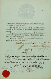 [PATENTE DE CORSAIRE] - PANATTIERI, GIACOMONE, MUSELLI, COTTONI. Patente signée, Corte le 20 novembre 1793. 2 p. in-4°, en-tête imprimé Il consiglio generale residente nella città di Corte …et belle vignette, cachet de cire rouge in fine.