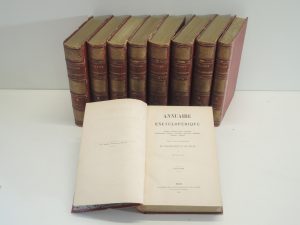 ANNUAIRE ENCYCLOPEDIQUE,PARIS, au bureau de l'encyclopédie XXe siècle. 1859-1871. Une multitude d'illustrations et de renseignements. Texte sur 2 colonnes. 9 volumes en demi bas, titre or et dos orné. Ensemble un peu usagé.