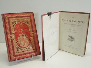 LES MILLE ET UNE NUITS, traduction de GALLAND, PARIS 1886 .Texte sur 2 colonnes et nombreuses illustrations. 2 volumes, reliure de ENGELS, jolie plaque sur le recto.