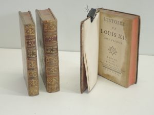 HISTOIRE DE LOUIS XII par JACQUES TAILHE, PARIS 1755. 3 vol, xlviij p, 394 p, xxiv p 360 p, xxiv p, 504 p. Pleine basane d'époque, tranche rouge, titre et tomaison sur 2 pièces peau et dos orné. Menus défauts.
