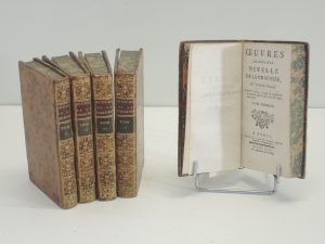 OEUVRES DE MONSIEUR NIVELLE DE LA CHAUSSEE, PARIS 1762.5 vol , xxxiijp, 354 p, 400 p, 391 p, 373 p, 215 p, 93 p de supplément. Pleine bas racinée, tranche marbrée, titre et tomaison sur pièce peau, dos orné. État d'usage.