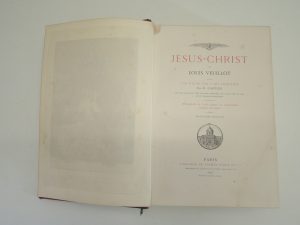 JESUS – CHRIST par LOUIS VEUILLOT avec une étude sur l'art chrétien par E.CARTIER. PARIS, FIRMIN DIDOT 1876. Illustré de gravures et de lithographies. Reliure éditeur avec sur les plats un semi d'oiseau et cartouche au centre. Dos orné,...