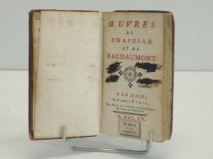 OEUVRES DE CHAPELLE ET DE BACHAUMON, LA HAIE, PARIS, chez QUILLAU 1755. lxvjp, 320 p.1 vol pleine bas d'époque titre sur pièce et dos orné. Coiffes arasées, frottements d'usage. EX LIBRIS MORE DE CAMPENNELLE.