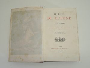 LE LIVRE DE CUISINE par JULES GOUFFE comprenant la cuisine de ménage et la grande cuisine, PARIS, HACHETTE 1867. Édition originale. Illustré de chromolithographies et de vignettes sur bois. Reliure en demi chag, tranche peigne, titre or et...