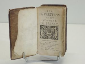 LES ENTRETIENS DE FEU MONSIEUR DE BALZAC, PARIS chez AUGUSTIN COURBE 1659. Frontispice, épitre, 387 p + table. Reliure d'époque délabrée.