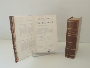 DICTIONNAIRE GENERAL DES SCIENCES THEORIQUES ET APPLIQUEES par MM. PRIVAT-DESCHANEL, AD. FOCILLON, PARIS 1880. Texte sur 2 colonnes, nombreuses illustrations. 2 vol, demi bas, titre or et dos fileté. 1 plat papier déchiré, état d'usage.