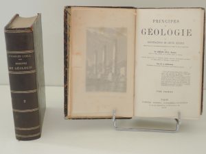 PRINCIPES DE GEOLOGIE ou illustrations de cette science par Sir CHARLES LYELL, PARIS 1873. Avec des cartes et des gravures. 2 vol, demi chag, dos fileté et titre or. Défauts d'usage.
