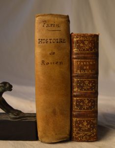 contenant ses accroissemens, sa fondation celles des Eglises et Monastères ; l’état ecclésiastique ; noms et demeures des personnes nobles ou vivant Noblement ; le baillage ; juridiction consulaire, etc. les Elections, Hautes-justices, le commerce, les corps d’arts et métiers, tarifs d’aunages et autres ; avec les Maisons royales et les Républiques de l’Europe… Année 1776. Dédié à Mgr. De Crosne.Rouen, chez Machuel 1776. In 16° plein veau de l'époque, 496 pp. On y joint : Farin (M.) - Histoire de la ville de Rouen (première partie). Rouen, Jacques Hérault 1668. In 12° plein vélin de l'époque, 14 ff., 534 pp. 9 ff.