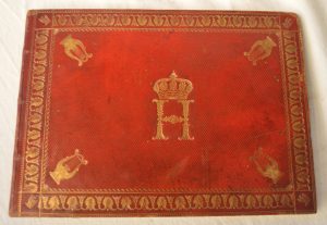 s.l. s.d. (1830) In 4° oblong plein maroquin rouge orné d'un H couronné au centre du premier plat. Célèbre album de 12 romances de la Reine Hortense. portrait et 12 lithographies hors-texte de Lépaule. Bel exemplaire.