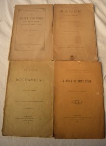 Réunion de 5 plaquettes. 1- Mort et descendance du Marquis de Jarzé. Angers 1883. 2 – La villa de Saint-Félix. Angers 1892. 3 – Autour des Rochambeau. Angers 1900. 4 – Baugé au Xvème. Angers 1879. 5 – Un petit collègz avant et pendant la révolution. Baugé de 1682 à 1793. Angers 1880.