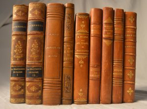 1 –Stendhal & Fournier (André) – La chatreuse de Parme. 2 volumes. 2 – Daudet (Alphonse) & Rousseau (Pierre) – Quarante ans de Paris. 3 – Balzac (Honoré de) & (Belot) Gabriel – Le curé de Tours. 4 – France (Anatole) Les contes de Jacques Tournebroche. 5 – Villiers de l'Isle Adam & Beloff (Angélina) – La torture par l'éspérance. 6 – Barrès (Maurice) & Friesz (Othon) – Un jardin sur l'Oronte. 7 – Huysmans (J. K.) & Jouas (Charles) – Croquis parisiens. 8 – Geoffroy (Gustave) – L'apprentie. Usures aux reliures.