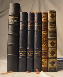 1 – Bidou (Henry) – Paris. Gallimard, NRF 1938. In 8° demi maroquin à coins. Un des ex. sur Alfa. 2 – Nolhac (Pierre de) – Trianon. Paris, librairie Conard 1927. In 8° demi maroquin à coins. 3 – Mauclair (Camille) & Jouas (Charles) – Le charme de Versailles. Paris Piazza 1931. In 8° demi chagrin. 4 – Gosset (Léon) & Doba (André de) - Le charme de Paris – Eglises. Paris Piazza 1934. In 8° demi chagrin bleu à coins. 5 - Gosset (Léon) & Willaume (Louis) - Le charme de Paris - Jardins. Paris Piazza 1933. In 8° demi chagrin bleu à coins. 6 – Pillon (Edmond) & Samson (Charles) - Le charme de Paris – Monuments. Paris Piazza 1935. In 8° demi chagrin bleu à coins.