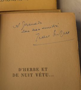 1 – Yaki (Paul) – Une biche du Second Empire – Rosalie, la princesse Russe. Brest, nouvelles éditions bretonnes 1955. In 12 ° broché, 308 pp. 2 – Parrot (Louis) – Le grenier à sel. Paris, Robert Laffont 1943. In 12° broché, 291 pp. 3 – Richard (Elie) & Boulage (Henri) – Paris qui meurt. Paris, Eugène Figuière 1923. In 16° broché, 161 pp. 4 – Breffort (A.) - Paradis fin de section. Paris, L'élan 1947. In 12° broché, 250 pp. 5 – Guillaume (Louis) – Hans ou les songes vécus. Rodez, Subervie 1958. In 12° broché, 257 pp. Un des ex. sur Alfa. 6 – Denux (Roger) – Sainte odeur de la vie. Paris, la cité nouvelle 1924. In 8° broché, 63 pp. Un des ex. sur Velin, bien complet du bois gravé de Jo Rossi. 7 – Littré (Forence) – L'adolescence émerveillée. Paris, Grasset 1946. In 12° broché 246 pp. 8 – Violette (Jacques) – l'oeuf aux mirages. Paris, Gallimard 1938 In12° broché 234 pp. 9 – Vagne (Jean) – D'herbe et de nuit vêtu... Paris, Gallimard 1955. In 12° broché 255 pp. 10 – Sergent (Alain) – Le pain et les jeux. Paris, la jeune parque 1945. In 12° broché 239 pp. Avec une longue dédicace (8 pages) de l'auteur. 11 – Nadel (Henri) – Visage. Paris, René Debresse 1940. In 8° broché, 62 pp. Un des ex., sur Alfa Navarre.