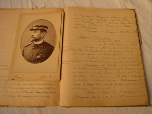 Journal – Cahier manuscrit 22 ff., retraçant sa carrière en tant que médecin de la Marine. Ce journal commence le 28 avril 1882 ou il est nommé aide-médecin et embarque sur le « Fontenoy » à destination de la Nouvelle-Calédonie (en passant par l'ile de Ré) pour y emmener des condamnés. Puis il embarque sur le « Bien-Hoa » à destination de la Cochinchine via Port Saîd, Aden, Singapour. Il reste en Cochinchine de 1884 à 1887 et participe à la campagne du Phu-Yen. Il est rapatrié à Marseille à la fin de l'année 1887 car il est atteint de dysenterie aigue. Il participe ensuite à un voyage en Islande sur L'Indre durant huit mois. Il embarque ensuite sur l'Aréthuse (Mission à Porto-Novo, La Havane, La Jamaîque, La Nouvelle-Orléans)... etc. On y joint 22 documents et manuscrits (concernant pricipalement ses nominations et embarquements) ainsi qu'une photographie le représentant en uniforme.