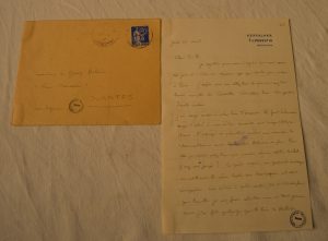 Peintre, Graveur et illustrateur. L.A.S., In 8° à en tête de « Kerfalher Penestin - Morbihan 1 ff., datée du jeudi 21 avril, adréssée à Albert Gavy-Bélédin. Dans laquelle il regrette de ne l'avaoir pas revu, car il rentre directement à Paris. Il indique qu'il à songé à la proposition de Gavy-Bélédin (publication d'un livre sur les oiseaux) et il lui donne quelques précisions... Lettre provenant des archives d'Albert Gavy-Bélédin qui ont été confiées à la B.M., de Nantes (qui a apposée son tampon), ces archives ont été ensuite rendues à la famille.