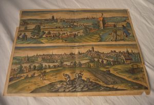 Hoefnagel (Georg) - Andegavum vulgo Angiers. Turones vulgo Tours, le Jardin de France. Braun, Cologne, (Circa 1610). Gravure couleur sur cuivre de (46 x 37 cm), comprenant deux vues sur la même gravure. Extrait de "Civitates Orbis Terrarum" Texte au dos en latin. Première représentation de la ville d'Angers. Nombreuses restaurations anciennes. Déchirures en marges.
