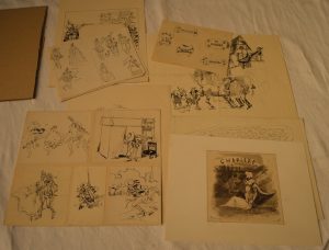 Ensemble de 13 dessins originaux de divers formats ( 8 dessins à l'encre et 5 au crayon). Il s'agit de dessins ayant probablement servi à illustrer « Histoire de Manon Lescaut, Vielle idylle, Revue des quat' saisons... etc.»