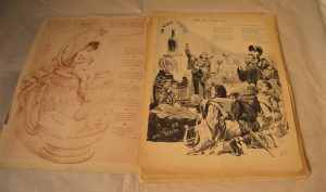 Ensemble de 17 menus des « diners du Bon-Bock » N° 297-298-299-300-301-302-303-304-305-306-307-308-309-311-312-315-316. Textes de Pradère, Ruelle,Durocher, Le Coq... etc. Illustrations d' Eugène Carrière, Moloch, Rivet, Robida, Bayard, Steinlen... etc. Pliures centrale, qq déchirures en marges, manque de papier en marges pour le n°315, déchirure pour le N°312.