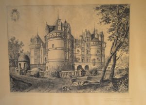 Le château du Lude. Eau-forte (Epreuve d'artiste, 58 x 44 cm), signée dans la planche datée 10 février 1892. Enrichie d'une d'un bel hommage autographe d'Octave de Rochebrune à la comtesse Georges de Talhouët-Roy, daté de mars 1892.