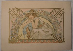 Lithographie originale en couleurs et encre métallique (pour l'or). Paris, Champenois s.d. (circa 1900). Avis de passage, 2 ff. ( x cm). Très bel état.