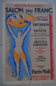 Affiche « Salon du franc », organisé par Paris-Midi au Musée Galliera Paris, du 22 au 31 octobre 1926. Lithographie (60 x 39 cm), manques en marges à chaque coin de l'affiche.