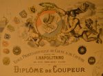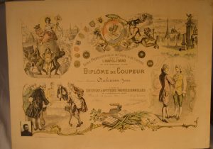 Diplôme de Coupeur (école professionnelle de Coupe et de Couture fondée par J. Napolitano) daté du 12 janvier 1961 pour Jean Dakessian , lithographie (75 x 48 cm), imprimerie Lafontaine à Paris.