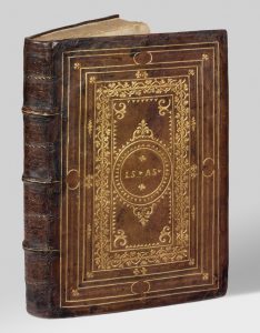 In-4 (210 x 148 mm), maroquin fauve, multiples filets dorés et à froid en encadrement avec petits fers de trèfles aux angles, rectangle central bordé d'une large roulette de lierre dorée, fers dorés aux écoinçons, médaillon circulaire au centre contenant les lettres is.as., dos orné de motifs à froid, tranches dorées et ciselées, attaches manquantes, boîte de toile moderne (Reliure de l'époque).