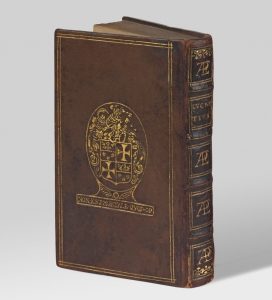 In-16 (114 x 68 mm), veau fauve, double filet doré, armoiries et devise au centre, dos orné d'un chiffre répété, tranches mouchetées (Reliure de l'époque).