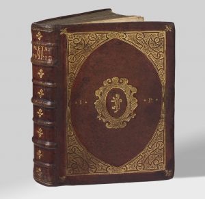 2 ouvrages en un volume in-4 (202 x 152 mm), maroquin rouge, larges écoinçons d'arabesques à fond doré déterminant un ovale central, fleurons dorés aux angles, armoiries au centre, flanquées de part et d'autre des initiales dorées I et R, dos orné d'un fleuron doré répété, tranches dorées et ciselées, boîte de toile moderne (Reliure de l'époque).