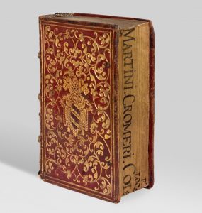 Elle présente toutefois un fer armorié que l'on retrouve sur d'autres reliures réalisées pour Pie V (cf. p. ex. Hobson, French and Italian collectors and their bindings, n°70).