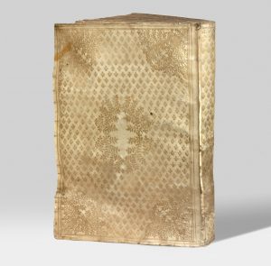 In-folio (273 x 180 mm), vélin souple, triple filet doré en encadrement, larges écoinçons à têtes d'angelot en médaillon et gerbes de feuillages, au centre médaillon ovale de tiges feuillagées, fond orné d'un semé de petites fleurs de lis, dos fleurdelisé en long dans un filet d'encadrement, tranches dorées, boîte de maroquin brun (Reliure de l'époque). Seconde édition en partie originale.