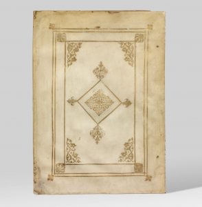 Petit in-4 (230 x 164 mm), couverture en vélin souple, double encadrement de filets dorés avec fleurons aux angles et aux écoinçons, gerbe de fleurons dorés central dans un losange de filets, dos lisse muet, tranches lisses, boîte en toile moderne (Reliure romaine de l'époque).