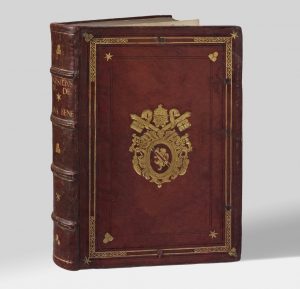 In-4 (237 x 167 mm), maroquin rouge, fine bordure dorée sertie de filets à froid en encadrement, pièces d'armes (étoiles et collines) dorées aux angles, armoiries dorées au centre, dos orné des mêmes pièces d'armes, tranches dorées, attaches manquantes (Reliure romaine de l'époque).