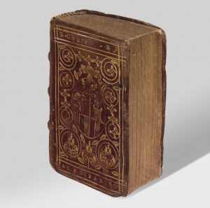 In-16 (116 x 75 mm), maroquin fauve, double filet et décor de volutes et fleurons dorés, mentions dorées et armoiries différentes sur chaque plat, b. curtus r. / acad. parth. sur le premier plat, n. nuccius / acad. parth. sur le second, dos orné, tranches dorées et ciselées, attaches manquantes (Reliure de l'époque).