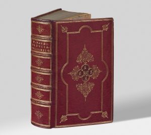 In-12 (127 x 72 mm), maroquin rouge, double filet doré, encadrement intérieur aux côtés lobés orné de fleurons aux angles, médaillon quadrilobé mosaïqué en maroquin grenat au centre des plats, frappé d'un chiffre et de quatre fermesses dorés et bordé de quatre gerbes de petits fers dorés, dos orné de caissons au double filet et de fleurons au pointillé, filet pointillé sur les coupes, dentelle intérieure dorée, tranches dorées (Macé Ruette).