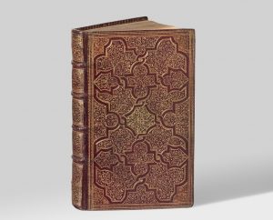 In-12 (147 x 92 mm), maroquin rouge, riche décor de compartiments ornés aux petits fers pointillés, cartouche hexagonal mosaïqué de maroquin olive au centre, écoinçons mosaïqués de maroquin fauve aux angles, dos orné de caissons aux fers pointillés, roulette sur les coupes, dentelle intérieure dorée, tranches dorées (Reliure de l'époque).