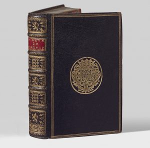 In-8 (160 x 101 mm), maroquin bleu nuit, triple filet doré, armoiries dorées au centre, dos orné de pièces d'armes alternées, roulette sur les coupes, dentelle intérieure dorée, tranches dorées (Reliure du début du XVIIIe siècle).