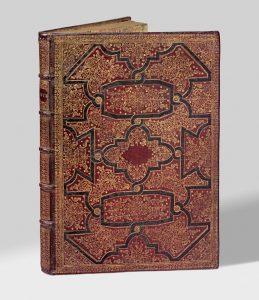 In-4 (275 x 208 mm), maroquin rouge, décor à compartiments déterminés par un listel noir ornés aux petits fers de volutes filigranées, points et fleurons dorés, dos orné à la grotesque, dentelle intérieure dorée, tranches dorées (Reliure de l'époque).