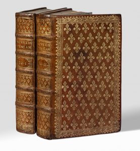2 volumes in-8 (155 x 96 mm), maroquin fauve, dentelle dorée, plats ornés d'un semé de fleurs de lis dorées, dos orné de même, roulette sur les coupes, tranches marbrées (Reliure de l'époque).