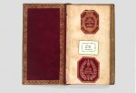 In-16 (120 x 64 mm), maroquin havane, bandes de maroquin rouge mosaïqué ornées de croisillons et d'étoiles dorés en encadrement, disques de maroquin citron mosaïqué aux angles, dos orné de caissons alternant maroquin rouge et citron maroquin mosaïqué, roulette sur les coupes, doublures en maroquin rouge encadrées d'une dentelle dorée, tranches dorées sur marbrure (Reliure de l'époque).