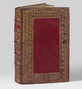Ces gravures sont encadrées d’un filet doré manuscrit, de même que les 4 ff. blancs ouvrant et fermant le volume. Belle reliure en maroquin lavallière à large dentelle droite encadrant un rectangle mosaïqué de maroquin rouge. Le subtil décor permet d’attribuer l’exécution de cette reliure à l’atelier de Luc-Antoine Boyet.