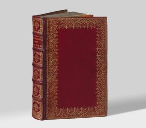 In-12 (157 x 95 mm), maroquin rouge, large dentelle dorée, dos orné, roulette sur les coupes, dentelle intérieure dorée, doublure et gardes de papier doré et colorié, tranches dorées sur marbrure (Reliure de l'époque).