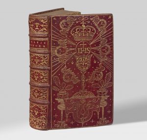 In-12 (165 x 90 mm), maroquin rouge, riche composition au filet et petits fers dorés sur les plats représentant, posé sur l'autel, un calice couronné surmonté du monogramme IHS d'où irradient six angelots, dos orné en alternance des monogrammes IHS, MA et d’un fer aux instruments de la Passion, dentelle intérieure dorée, doublure et gardes de papier d'Augsbourg, tranches dorées sur marbrure (Augustin Duseuil).