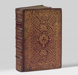 Une reliure similaire et frappée des mêmes armes est reproduite par G. D. Hobson dans son ouvrage sur Les Reliures à la fanfare. Il s’agit ici d’un exemplaire que le monarque avait coutume de faire distribuer, luxueusement relié à ses armes, dans l’entourage de la Cour.