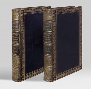 2 volumes in-folio (334 x 223 mm), maroquin bleu nuit à long grain, large bordure de palmettes dorées, dos richement orné de motifs de feuillage dorés sur fond pointillé, d'ombilics et de listels mosaïqués de maroquin rouge, filet torsadé sur les coupes, large dentelle intérieure dorée, doublures et gardes de moire amarante, tranches dorées (Bozerian).