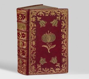 Grand in-18 (130 x 82 mm), maroquin rouge, large dentelle de palmes, rinceaux et libellules dorés, tulipes aux angles et grenade au centre dorées et mosaïquées en maroquin vert, dos orné de losanges mosaïqués, roulette intérieure dorée, doublures et gardes de papier d'Augsbourg, tranches dorées, étui moderne (Reliure de l'époque).